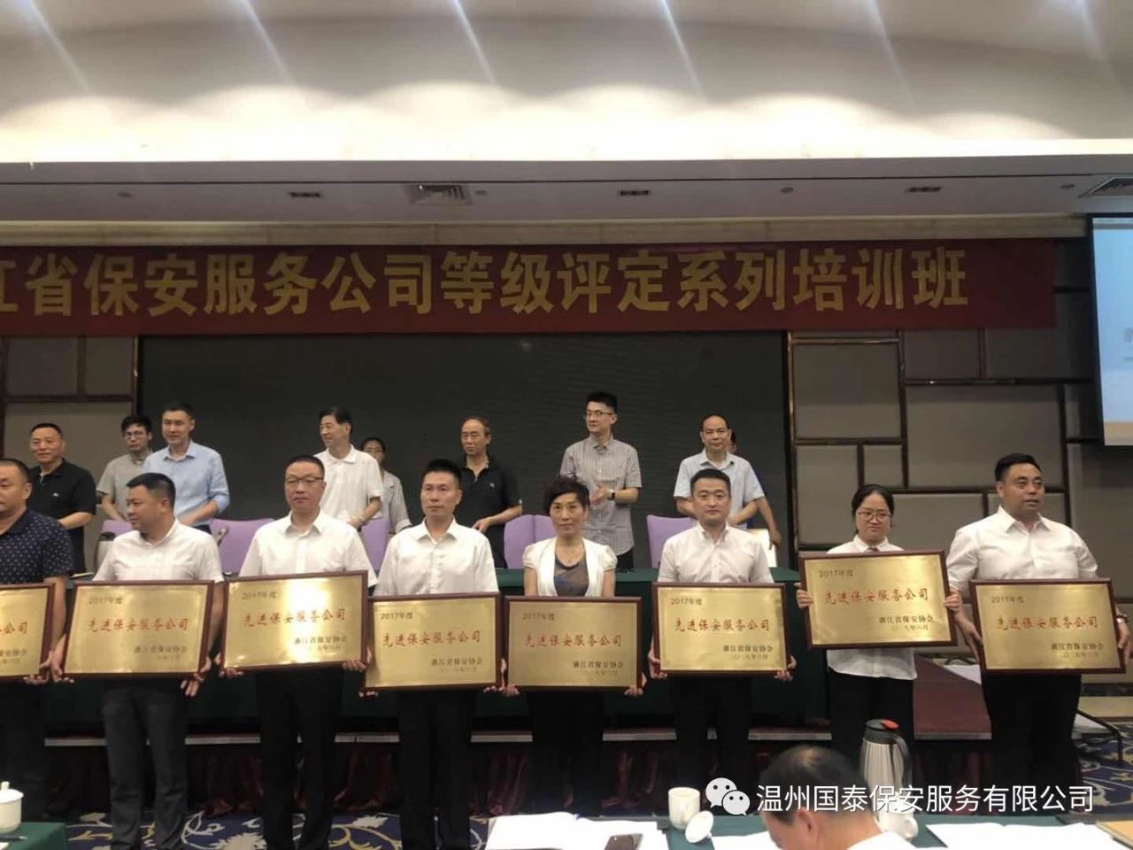 在表彰會(huì)上,溫州國泰保安服務(wù)有限公司被評為2017年度浙江省先進(jìn)保安服務(wù)公司,公司保安員楊庭旭被評為2017年度浙江省優(yōu)秀保安員.