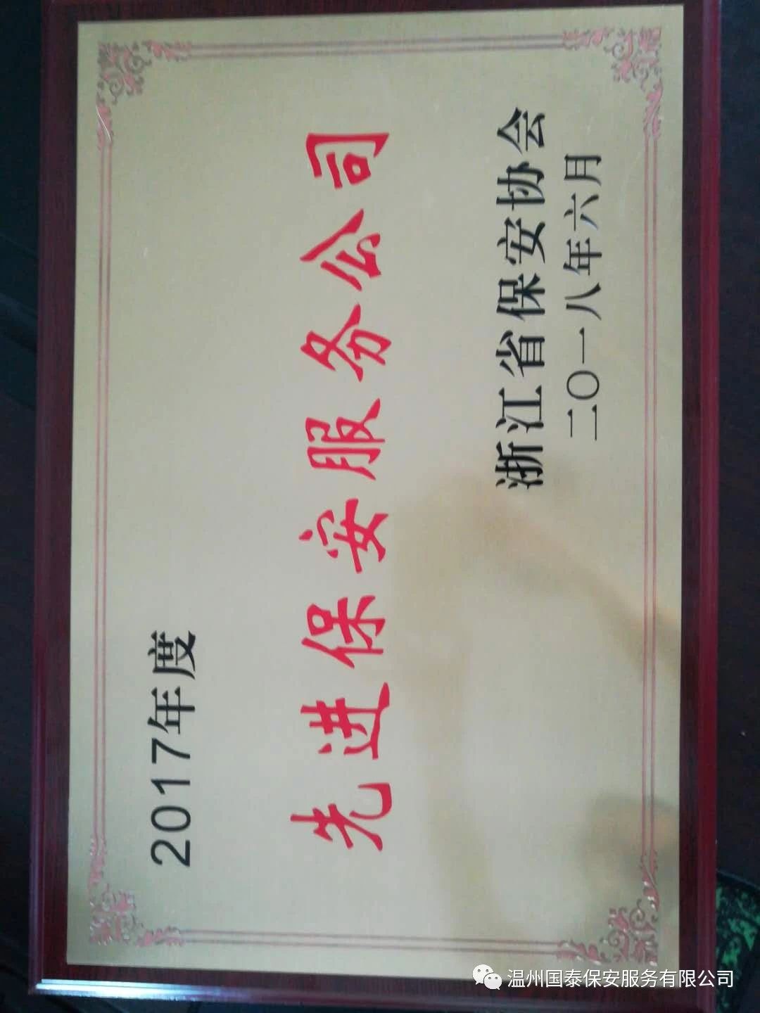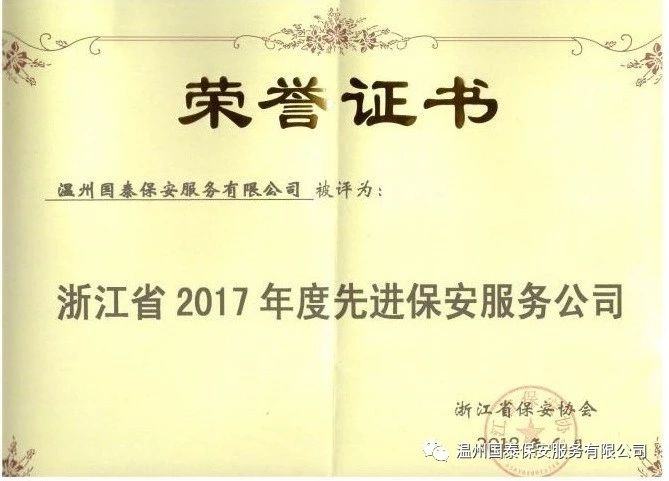 溫州國泰保安服務(wù)有限公司被評為2018年度浙江省先進(jìn)保安服務(wù)公司,公司保安員屠德印被評為2018年度浙江省優(yōu)秀保安員。