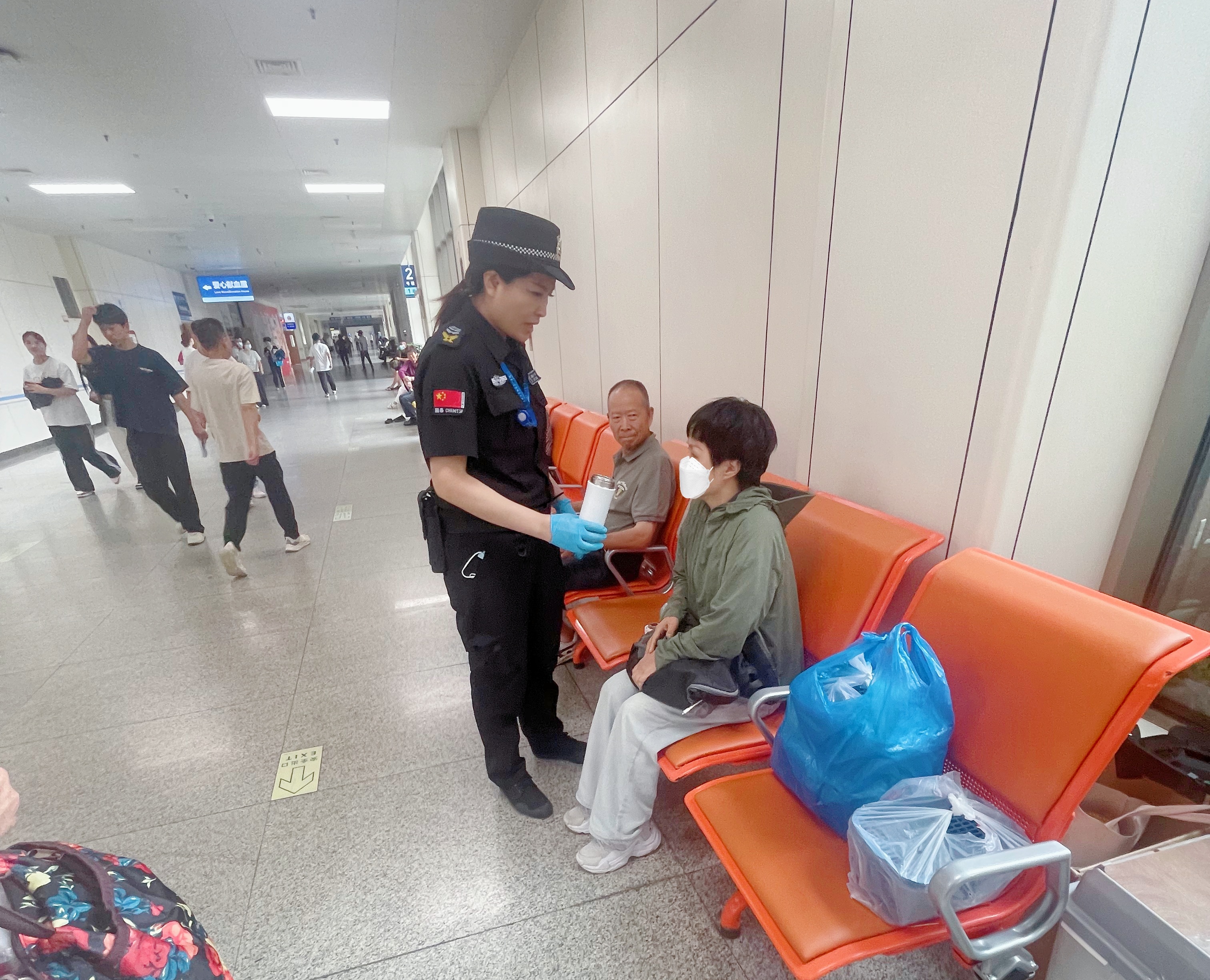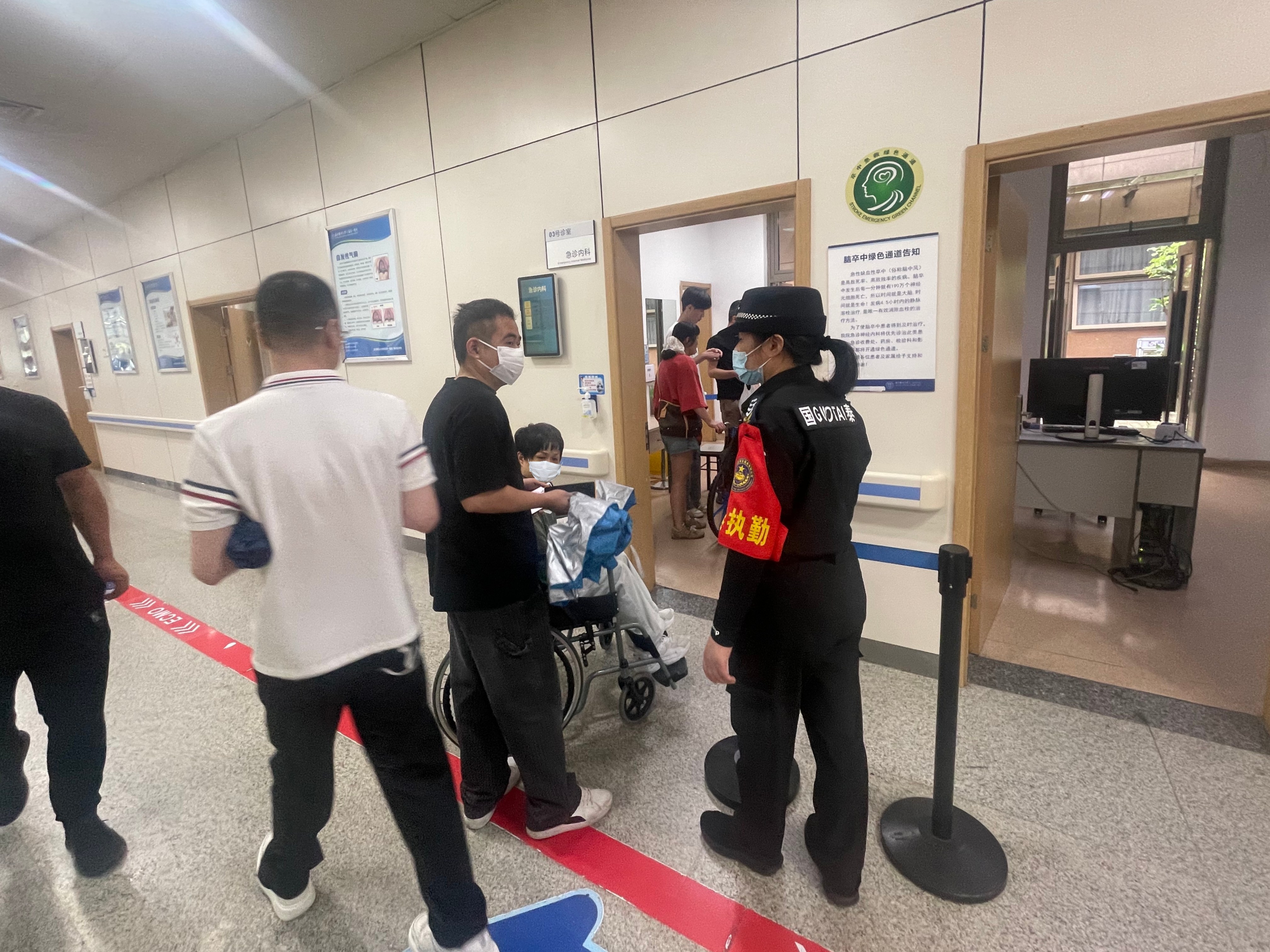 “大姐您哪里不舒服?”隊(duì)員當(dāng)即上前詢(xún)問(wèn),得知該患者來(lái)檢查膽囊情況出現(xiàn)畏寒癥狀、家屬尚在停車(chē)時(shí),該隊(duì)員立即啟動(dòng)應(yīng)急預(yù)案:攙扶至等候區(qū)就坐后,馬上送來(lái)溫開(kāi)水緩解寒顫,同步通過(guò)對(duì)講系統(tǒng)調(diào)來(lái)備用輪椅。在急診分診臺(tái)測(cè)得38.4℃發(fā)熱體征后,安保隊(duì)伍啟動(dòng)“就醫(yī)綠色通道”協(xié)作機(jī)制,從掛號(hào)取號(hào)到檢查全程陪護(hù),更貼心取出值班室應(yīng)急毛毯包裹患者給予保暖。